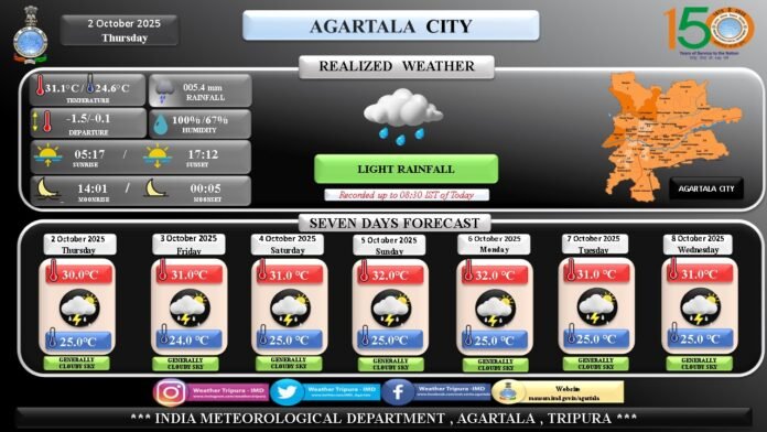 The India Meteorological Department (IMD), Agartala, has reported light rainfall in Agartala City today, recorded up to 08:30 AM IST. The maximum temperature stood at 31.1°C, while the minimum settled at 24.6°C. Rainfall was measured at 5.4 mm, with humidity levels ranging between 100% and 67%.