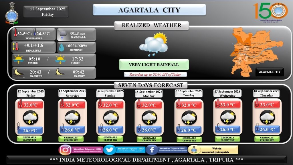 On September 12, 2025, Agartala recorded a pleasant morning with moderate humidity and mild temperatures. According to the India Meteorological Department (IMD), the city experienced a mix of sunshine and passing clouds, with chances of light showers in isolated areas during the late afternoon and evening hours. The maximum temperature is expected to hover around 32°C, while the minimum is likely to remain near 25°C.