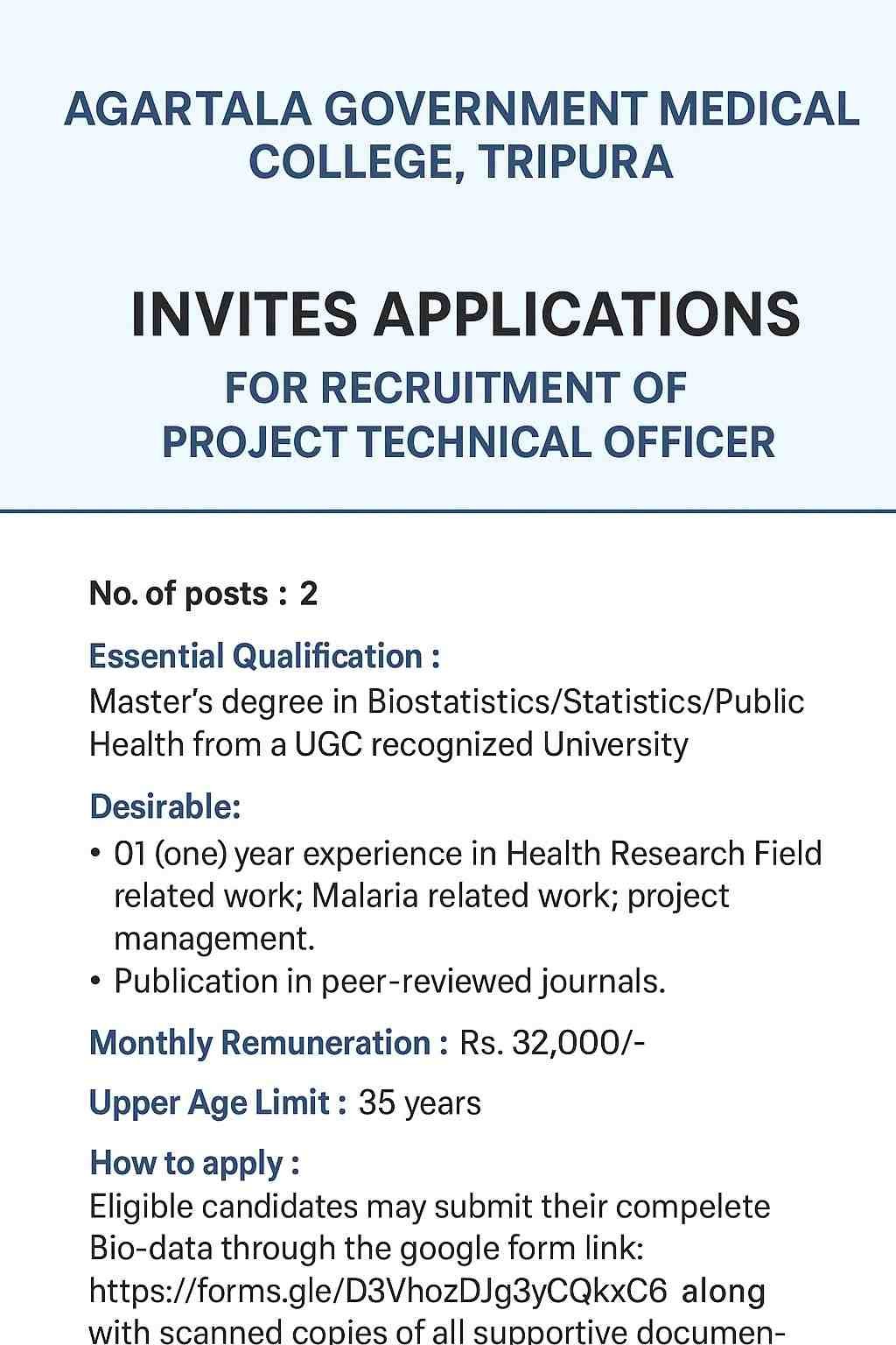 Agartala Government Medical College, Tripura has invited applications from eligible candidates for recruitment to technical positions under a research project titled “Effect of additional targeted and tailor-made repellent intervention package on malaria control in the very high malaria endemic areas of Dhalai District, Tripura – A quasi-experimental study.”