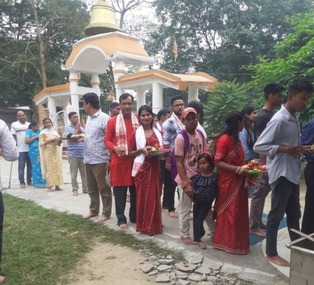 Shiva Shankar Sarma has traveled thousands of kilometers from Kathmandu to Tinsukia’s Tilinga Mandir with the whole family. Ties a bell in the temple and offers Puja to Lord Shiva and Dangoria Baba ( the holy people tree regarded as thousands of years old .)