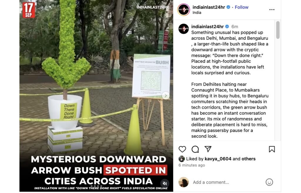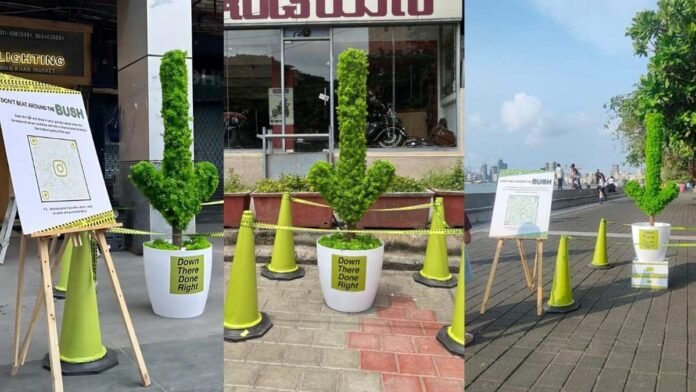 Something strange is catching the eyes of people across Mumbai and Bangalore. Giant green downward arrows have been turning up in busy public spots, each one wrapped in yellow tape that warns “Don’t Beat Around the Bush.”