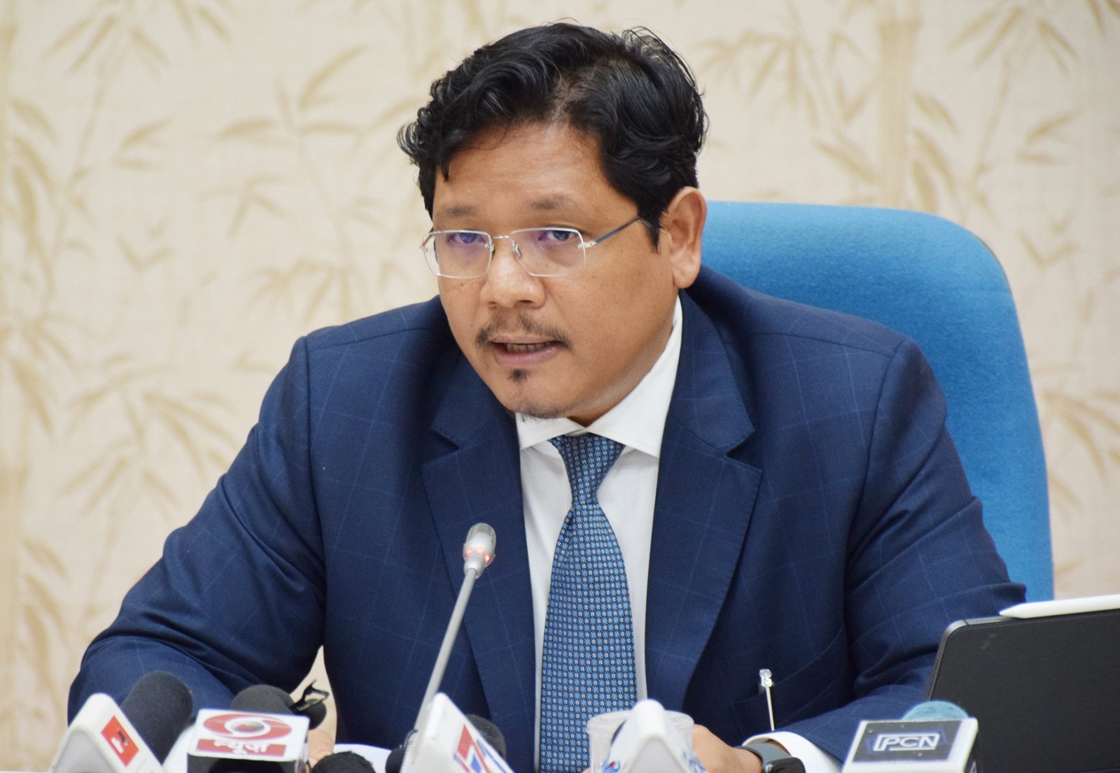 Chief Minister Conrad Sangma briefing to media persons after the review meeting at main Secretariat on Friday. (Photo by Sanjib Bhattacharjee).