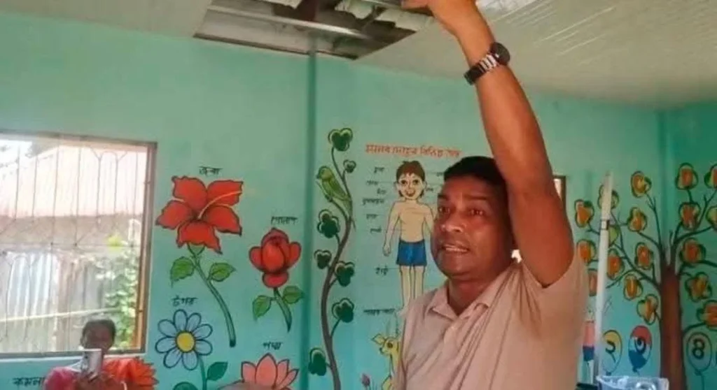 The ceiling of a newly renovated Anganwadi centre in Uttar Belonia suddenly collapsed during the day. Fortunately, the centre remained closed due to the Garia Puja holiday. Therefore, no children or staff were present, and authorities avoided a major tragedy.