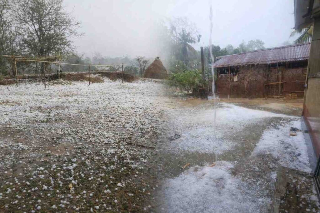 North Tripura witnessed severe weather conditions today as heavy rainfall lashed the region, accompanied by a sudden and intense hailstorm. Several areas, especially Dharmanagar, experienced significant disruption due to the extreme weather.
