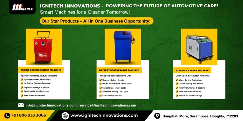 IGNITECH makes machines for internal engine carbon cleaning based on HHO, battery rejuvanation units and car/bike washing systems at its Hooghly Plant; and since all these are intended to be market low-investment models, they are aiming them at Tier 2 & rural markets.