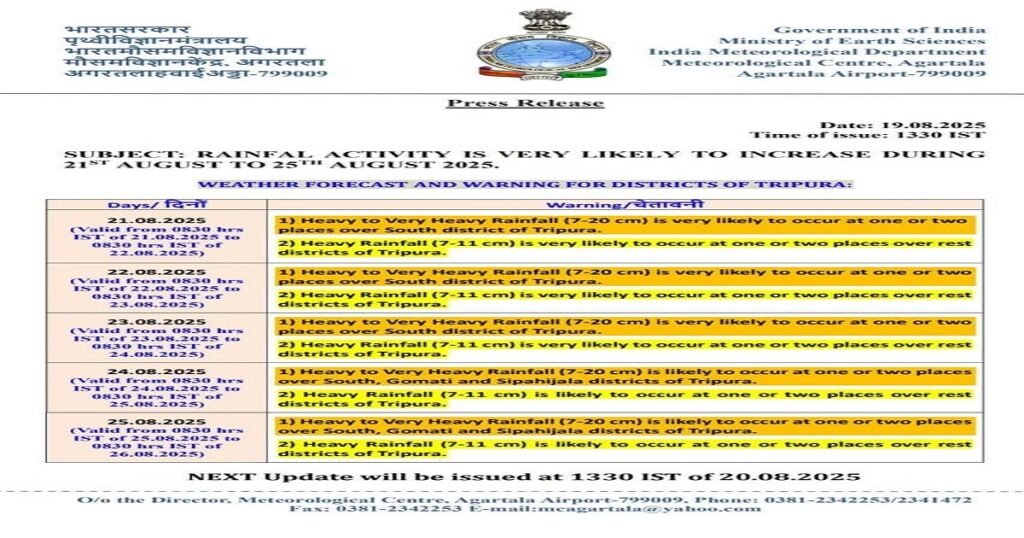 Agartala: The India Meteorological Department (IMD), Meteorological Centre, Agartala, has issued an advisory warning of heavy to very heavy rainfall likely to affect several parts of Tripura between August 21 and August 25, 2025. The southern districts of the state are expected to witness particularly intense rainfall.