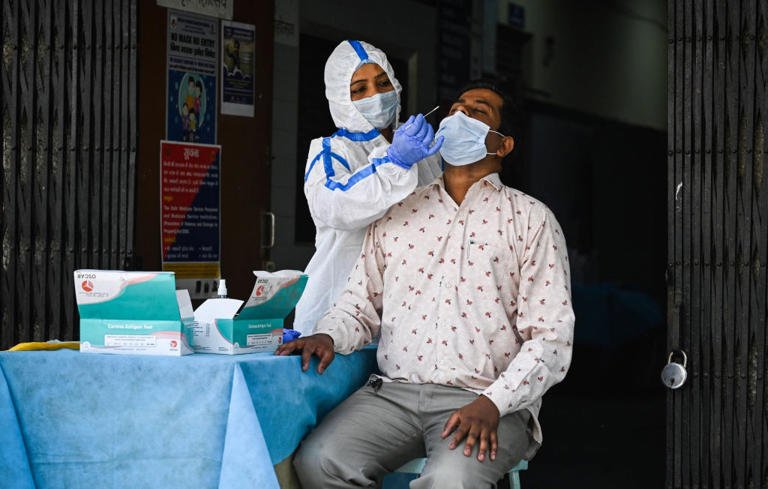 A health worker collects a swab sample at a Covid-19 testing booth in New Delhi