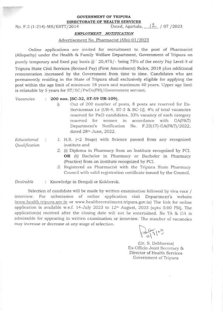 - Registered as a Pharmacist with the Tripura State Pharmacy Council, holding a valid registration certificate issued by the Council. Desirable: Knowledge of Bengali or Kokborok.
