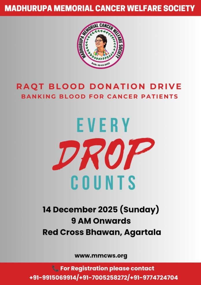 The Madhurupa Memorial Cancer Welfare Society is pleased to announce the RAQT Blood Donation Drive, to be held on 14th December 2025 (Sunday) at Red Cross Bhawan, Agartala, from 9 AM onwards. This initiative aims to support patients in need, strengthen blood bank reserves, and promote a culture of voluntary and responsible blood donation across the state.