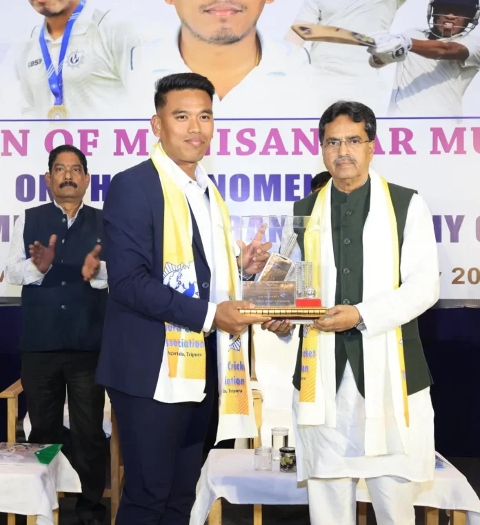 Tripura cricketer Manishankar Murasingh received a warm felicitation in Agartala on Wednesday after becoming the first player from the state to appear in 100 Ranji Trophy matches. The Tripura Cricket Association (TCA) hosted the ceremony, which drew senior government officials, former cricketers, sports administrators, and enthusiastic supporters.