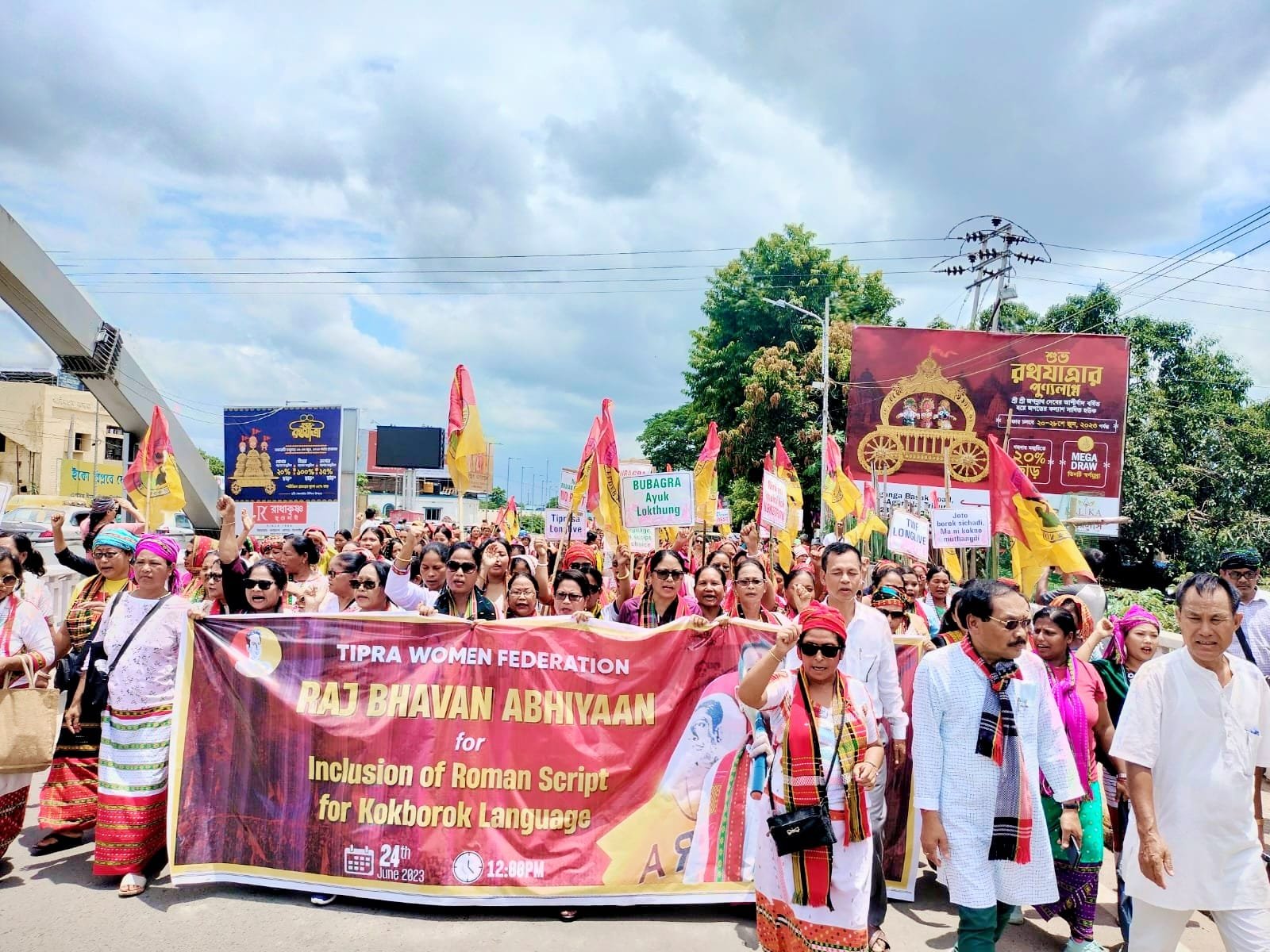 In a powerful display of unity and determination, the TIPRA Women Federation (TWF) organized a march to the Raj Bhawan on June 24, 2023, demanding the adoption of the Roman script for the Kokborok language. The women’s wing of TIPRA sought to convey a strong message to the Governor, urging them to address the long-standing demand of the people.