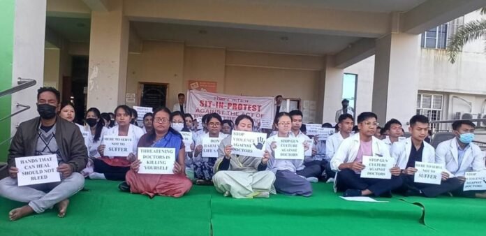 The strike, taking place at the JNIMS Superintendent’s office gate in Imphal East district, aims to bring attention to the challenges and harassment experienced by healthcare professionals. Banners at the protest site boldly declare, “Sit-in protest against the harassment of the medical fraternity.”