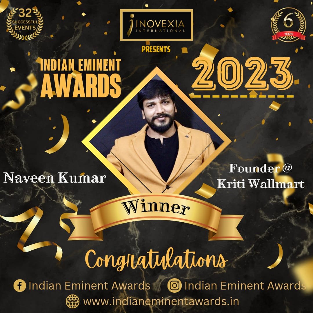 Meet Naveen Kumar (Viraj), Founder of Kriti Wallmart, the winner of the prestigious Indian Eminent Award for his outstanding contribution to the wallpaper industry. The Inovexia International awarded him the Elegant Award for Grandeur Wallpaper Art at the Novotel, Hitex, Hyderabad on May 7th, 2023.