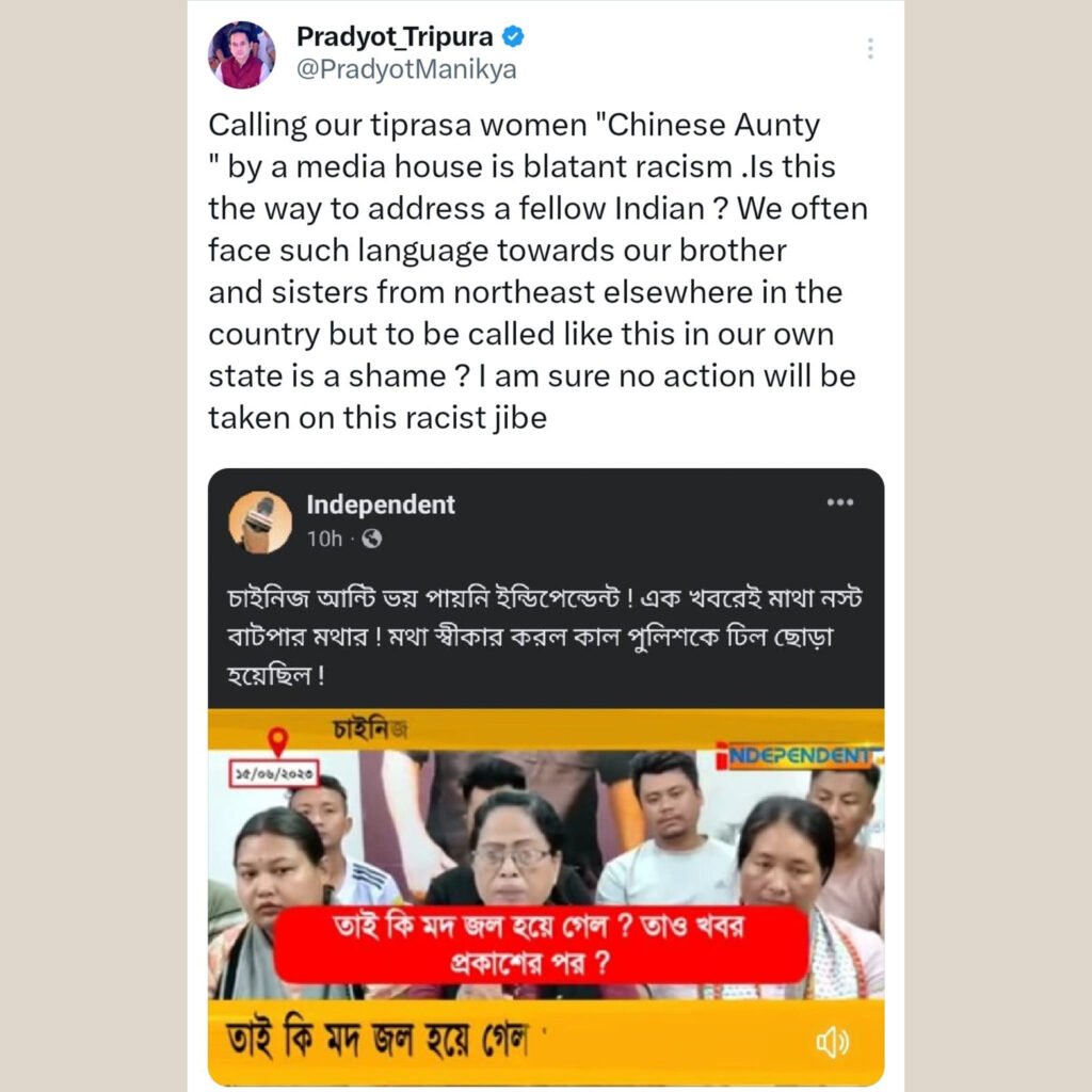 The incident gained further traction when Bubagra Pradyot Bikram Manikya DebBarma took to Twitter, condemning Independent News’ racist reportage. In his tweet, he expressed his outrage, stating, “Independent media’s racist reportage against all Tiprasa women by calling them ‘Chinese Aunties’ is an utterly unacceptable act. We demand immediate action to address this discriminatory behavior.”