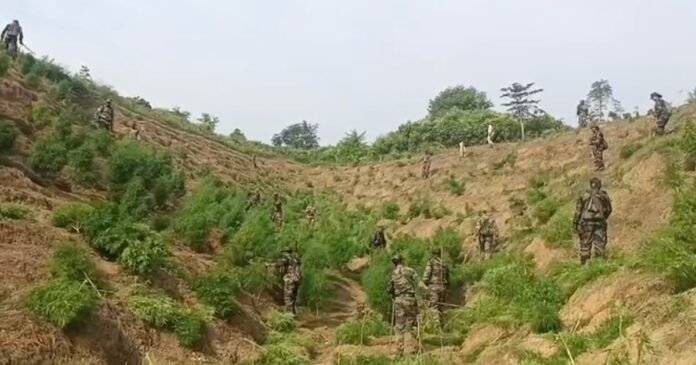 In a significant move against illegal narcotics, Bishalgarh police, with support from TSR, CRPF, and Forest Protection Force, carried out a large-scale operation in Raghunandan Thakur Para and Jagatrampur under Bangshibari ADC Village on Tuesday morning. Acting on precise intelligence, the security forces destroyed nearly 3 lakh cannabis plants spread across 70 plots.