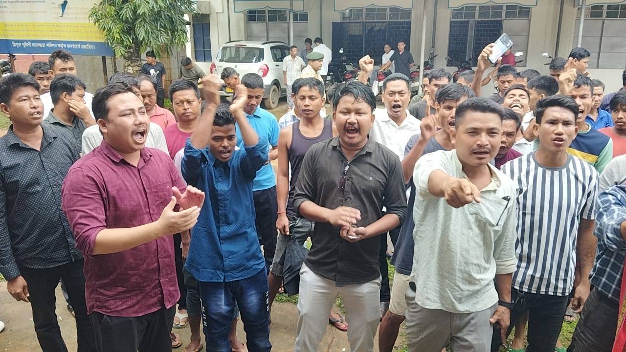 A protest was staged today in Tripura against the Superintendent of Agriculture following allegations of cutting down a rubber tree. The demonstration was organized by local residents who demanded immediate suspension of the official and compensation for the affected individual, identified as Manadhan Tripura.