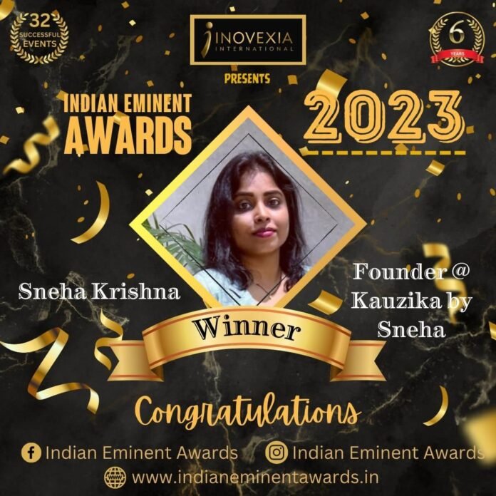 Sneha Krishna is the founder of Kauzika, a luxury Indian clothing brand that has redefined fashion with its custom-made, high-quality apparel. Her innovative approach to fashion has earned her the Trendsetter Award for Elite Fashion Apparel at the Indian Eminent Awards by Inovexia International.