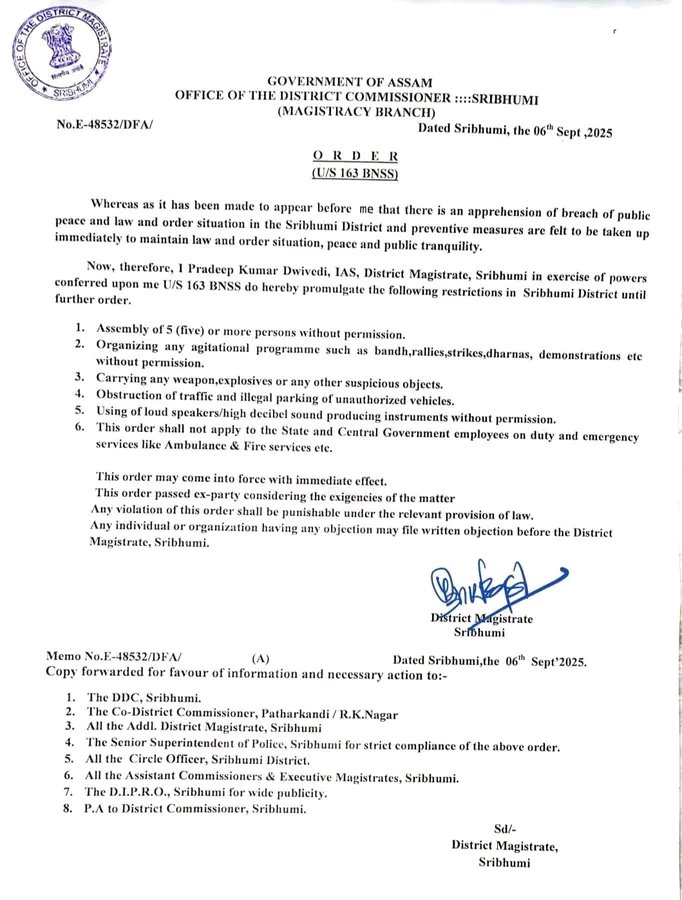 Guwahati: The district administration of Sribhumi has clamped down on all forms of unlawful assembly and gatherings under Section 163 of the Bharatiya Nagarik Suraksha Sanhita (BNSS), following apprehensions of a possible breach in peace and law and order in the district.