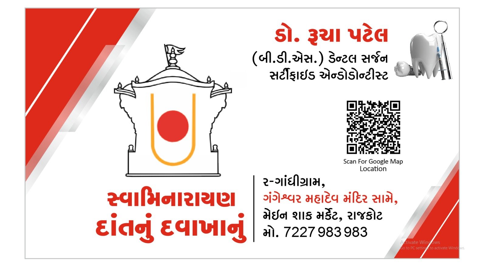 Conveniently located at 2-Gandhigram, Main Road, near the Gangeshwar Mahadev Temple and the Main Vegetable Market, Swaminarayan Dental Clinic provides a welcoming and comfortable environment for individuals seeking dental care. Dr. Rucha Patel, a skilled dental surgeon, brings her expertise and passion to the clinic, ensuring that each patient receives personalized and comprehensive treatment.