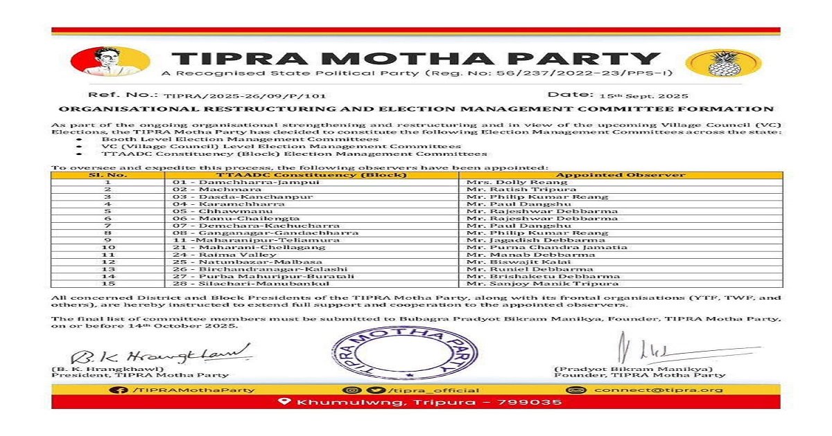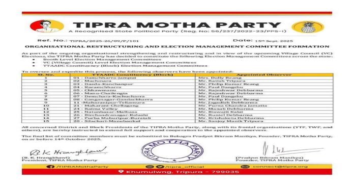 The observers will coordinate with district and block presidents of TIPRA Motha and its frontal organisations, including the Young TIPRA Federation (YTF) and TIPRA Women’s Federation (TWF). They have been instructed to extend full cooperation in forming committees at all levels.
