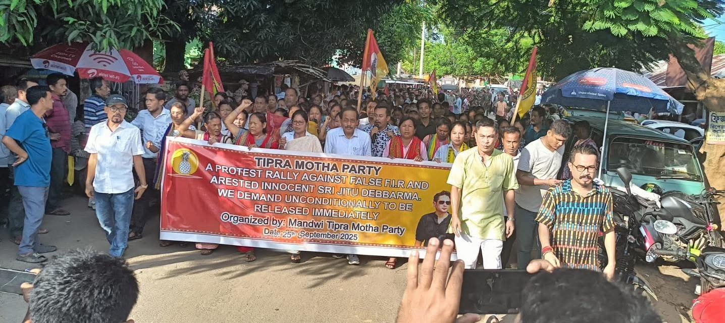 The Tipra Motha Party (TMP) organized a massive protest rally in Mandwi on Thursday, demanding the unconditional release of Jitu Debbarma, who was recently arrested following what the party has described as a false First Information Report (FIR).