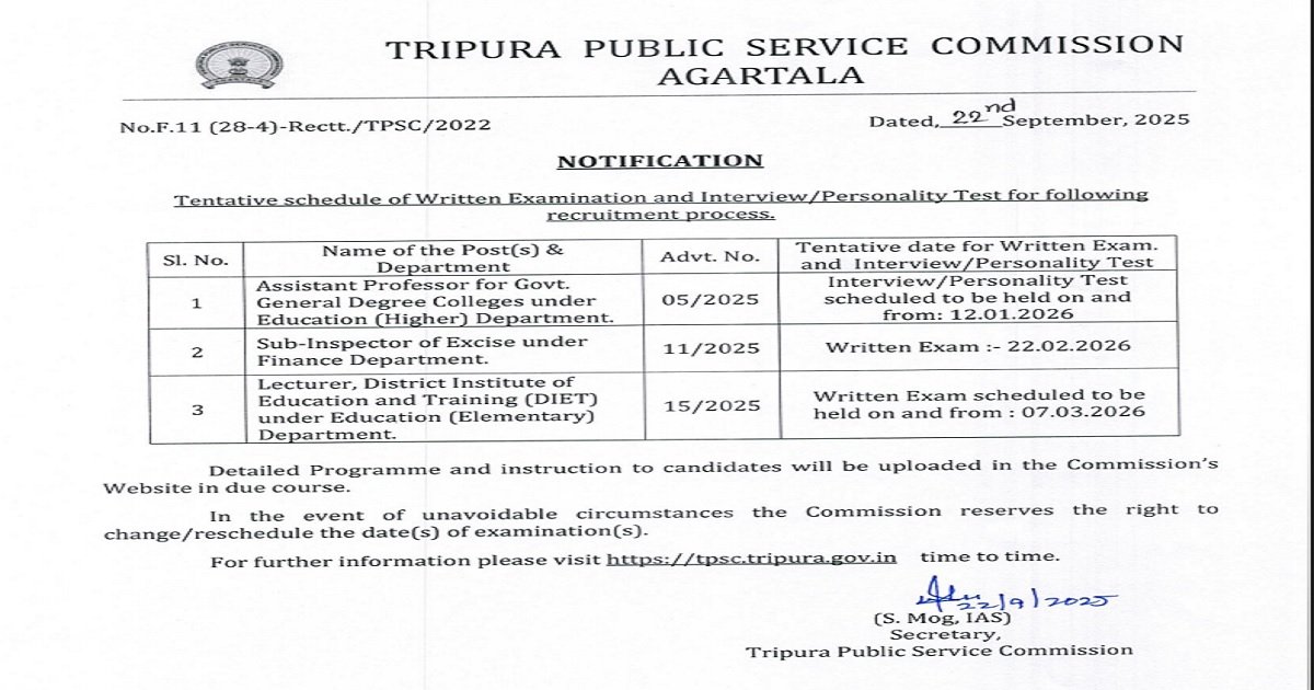 The Tripura Public Service Commission (TPSC) has officially released the tentative schedule for written examinations and interview/personality tests for various recruitment processes under different state departments.