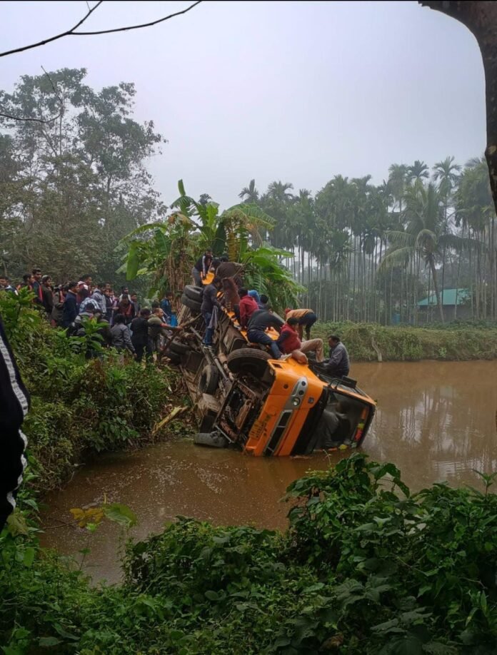 In a harrowing incident with potentially catastrophic consequences, a bus carrying twenty students and teachers from the National Institute of Technology (NIT) met with an accident near Kobra Khamar and Chakbasta area in Jirania subdivision. The unfortunate incident occurred at around 9:00 AM when the third NIT bus in a convoy lost control and slipped into a roadside pond. While the first two buses passed the area unscathed, the third bus’s mishap led to a frantic rescue operation by locals.