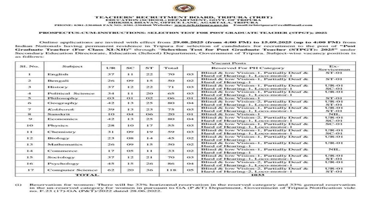 A total of 1,033 vacancies have been announced for Post Graduate Teachers (Class XI–XII) under the Directorate of Secondary Education, Education (School) Department, Government of Tripura.