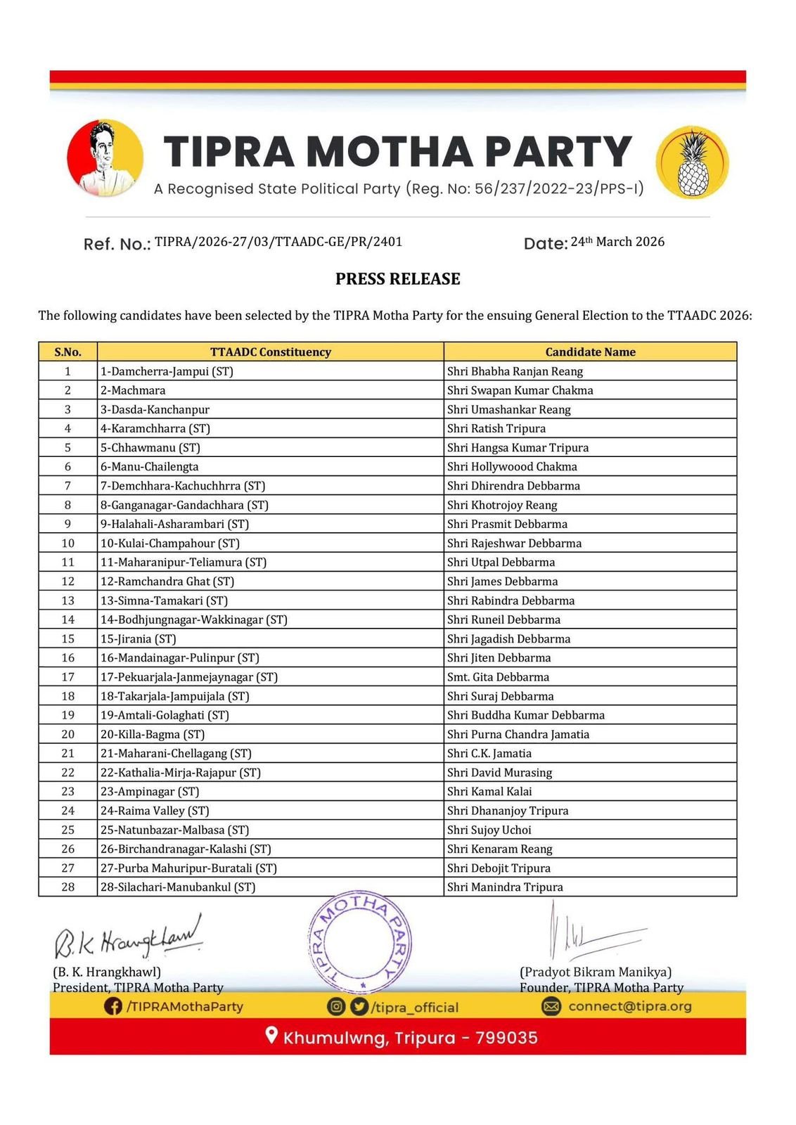 The Tipra Motha Party finalized 28 candidates for ADC elections, triggering internal unrest over exclusions and representation issues.