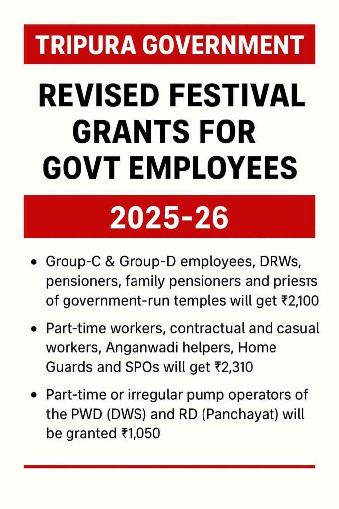 The Government of Tripura has announced revised rates for Festival Grant and Festival Advance for the financial year 2025–26, providing additional festive support to government employees, pensioners, and associated workers.