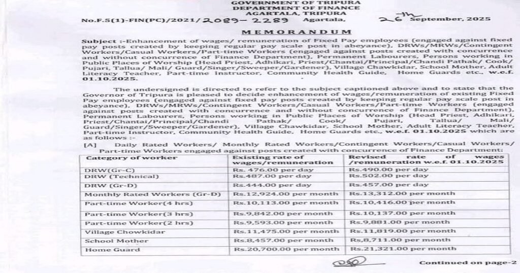 The Government of Tripura has announced a significant revision in wages and remuneration for multiple categories of workers, marking an important step towards strengthening financial support for employees across the state. The revised pay structure, approved by the Governor of Tripura, will officially come into effect from October 1, 2025, covering Daily Rated Workers (DRWs), Monthly Rated Workers (MRWs), Contingent and Casual Workers, Part-time Workers, Permanent Labourers, Public Places of Worship staff, Village Chowkidars, School Mothers, Adult Literacy Teachers, Part-time Instructors, Community Health Guides, and Home Guards.