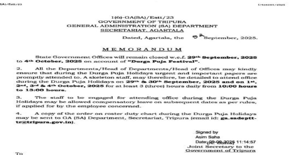 The Government of Tripura has officially declared that all state government offices will remain closed from September 29 to October 4, 2025, in view of the upcoming Durga Puja festival. However, the administration has clarified that urgent and essential work will not be affected during the six-day festive holiday.