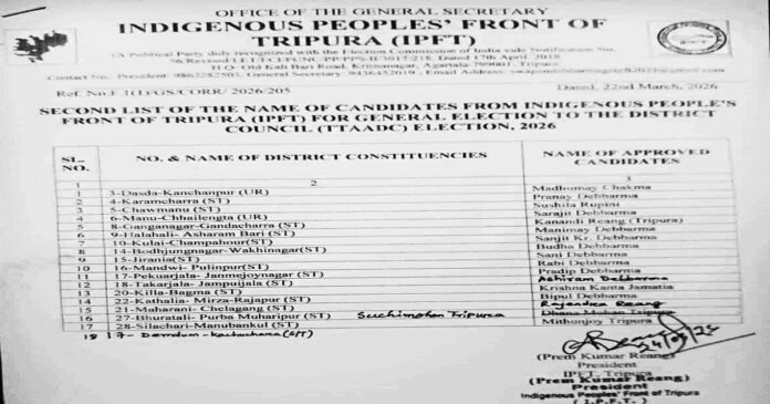 Indigenous People’s Front of Tripura has officially released its second list of candidates, thereby intensifying political activity ahead of the TTAADC elections.