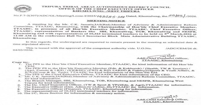 In a significant move concerning the long-standing issue of 10,323 terminated teachers in Tripura, the administration of the Tripura Tribal Areas Autonomous District Council (TTAADC) has initiated discussions to create alternative livelihood opportunities through bank-linked loan schemes.